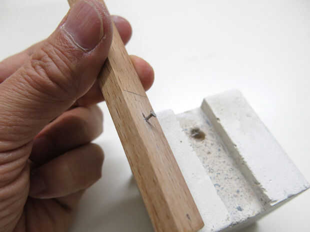 Prender un corta uñas en la madera, en la posición del agujero ciego. La cabeza del clavo debe salir por 2mm. La uña puede tener que acortar para que no cruce la madera.