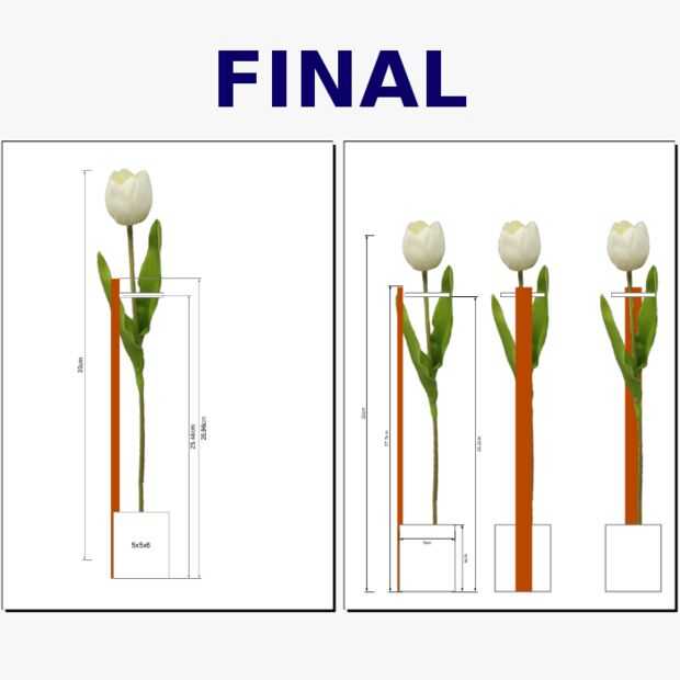 Usando un tulipán de madera para averiguar el tamaño de lo que será, primero hice un diseño en LibreOffice Draw para elegir una forma y determinar proporciones estéticas.
