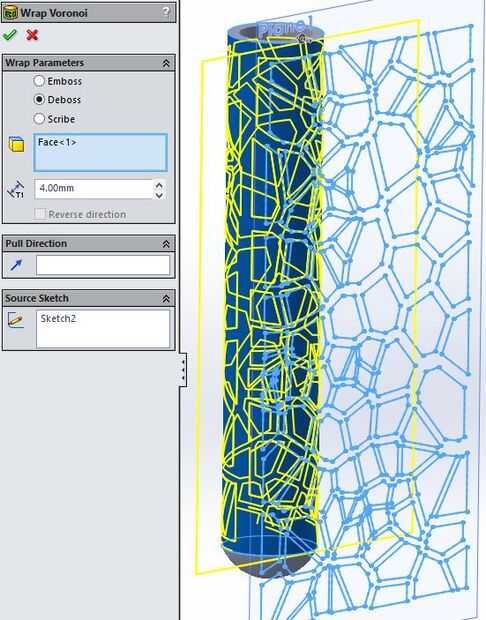 - En el cuadro de diálogo de Voronoi ir salvaje con estos números y lío hasta encontrar un patrón que se ve super cool. Los números importantes son modelo de ancho (la circunferencia exterior de lo que acaba de hacer en SW. sugerencia: Utilice la herramienta de medida , como se muestra en la captura de pantalla!) y altura de patrón (la altura de su tubo de ensayo desde su cima hasta donde empieza a en la curva en la parte inferior).