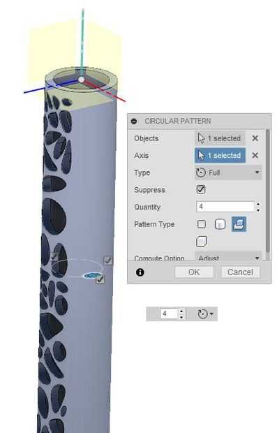 5. Hacer esto: crear > patrón > patrón Circular. De objetos, haga clic en la función de extrusión que acaba de crear en el árbol de la historia. Para el eje, eligió el eje del vaso. Probablemente el eje z o algo. Cambiar la cantidad a 4 y