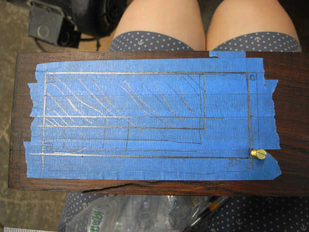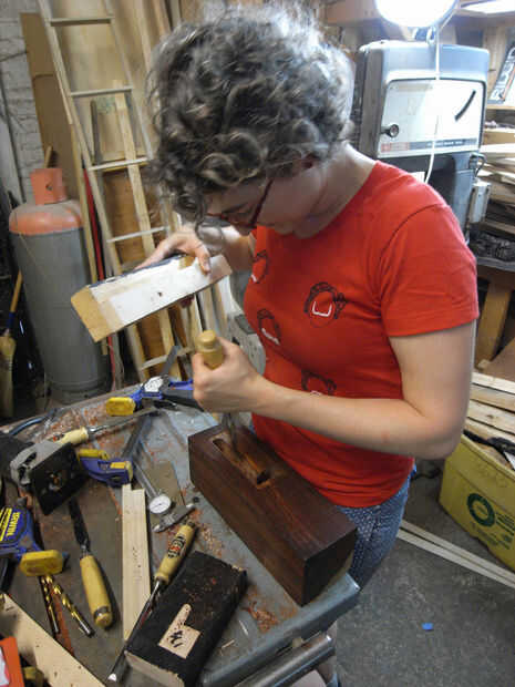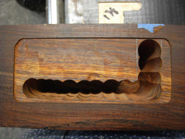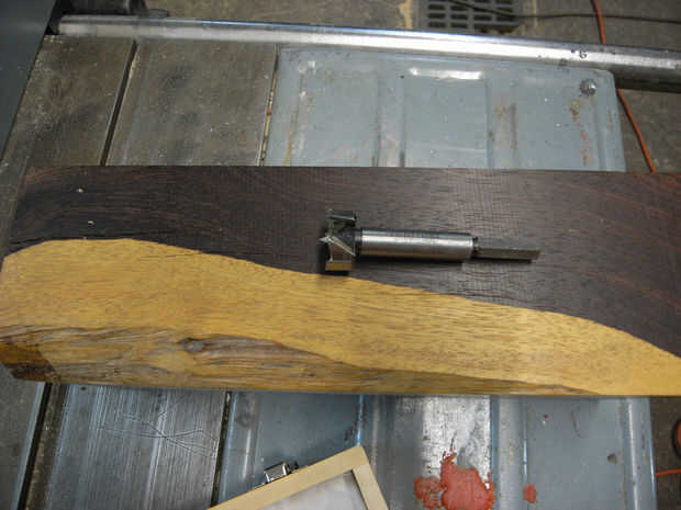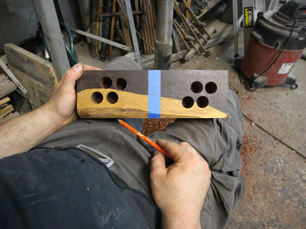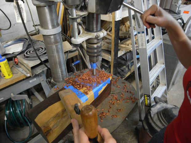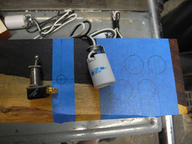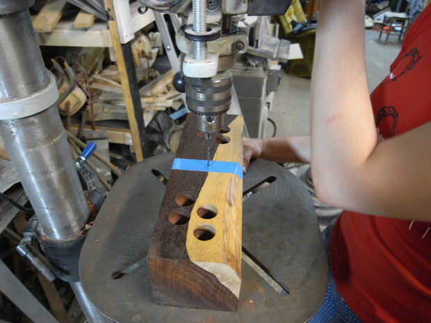 Luego use una prensa del taladro y brocas forstner para cortar los agujeros necesarios, cuatro para los tubos de ensayo y las tomas de luz. Taladre un agujero para el interruptor. Por último, rebaje el espacio para el cableado.
