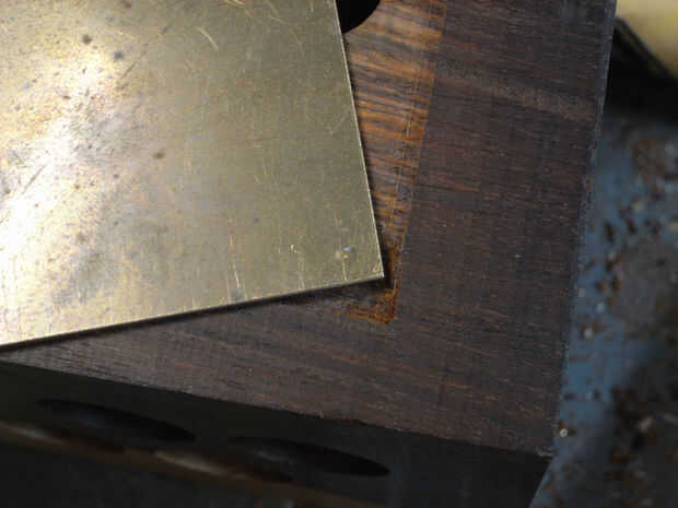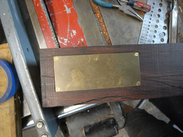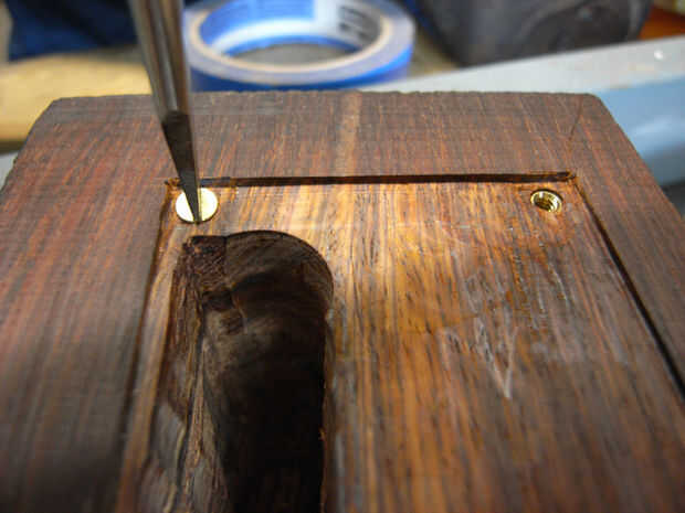 Para mantener todos los cables y todo eso en la parte posterior, usted querrá algún tipo de cubierta. He utilizado una placa de latón, conectada tornillos de latón. Para facilitar la toma de la placa de encendido y apagado según sea necesario, he añadido algunos rosca inserta. Esto es opcional, pero creo que los insertos que se vea un poco más pulido. Desafortunadamente, el bronce era un poco suave para conducir en tal solo con un destornillador, así que usamos el tornillo en el inserto de madera dura.