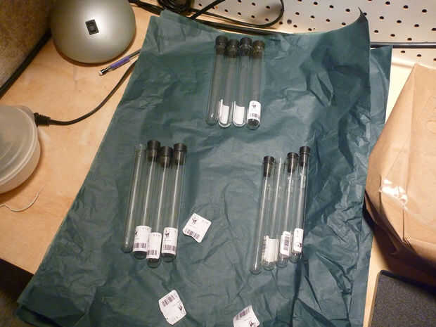 Una vez que haya encontrado algunos cristalería adecuada, medir cuidadosamente cada uno de sus tubos de ensayo, ya que en mi experiencia, son todos los diámetros ligeramente diferentes, y es crucial que los paneles de soporte mantienen perfectamente los tubos de ensayo.