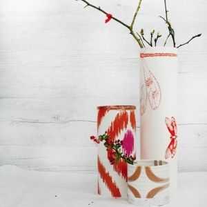 Aquí es una manera de crear un arreglo de vaso que se ve bien sin muchas flores. También puede utilizar estos floreros cilindro para cubrir un frasco o contenedor. Lo mejor es que hecho de tubos de correo postales y pedacitos de sobra de papel pintado, así que estamos reutilización fácil encontrar los materiales. Tratar de obtener muestras de papel pintado o los restos de su pintura o ferretería y mezclar y combinar algunos. Este tutorial trata de Lynn Pavey. Aquí está su Consejo: "el diseño es importante. Planificar cuidadosamente y pasar tiempo pensando en las posibilidades. Solo dos cilindros pueden tener una base (cada extremo del tubo). Piense en sus alturas por lo que son en buena proporción entre sí y también donde los diseños en el papel tapiz se sentará en su jarrón. No quieres cortar en de las secciones más atractivas! ".
