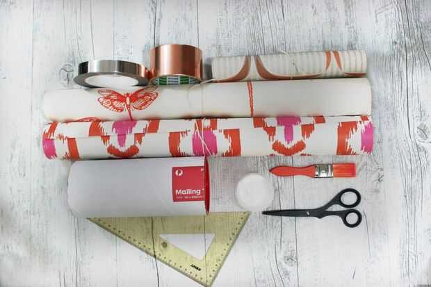 Viejo o nuevo correo electrónico tubos/cylindersWe hecho tres 'floreros' de un tubo, de aprox. 9cm diameterWallpaper muestras (ajuste recomendado: longitud de florero) HacksawRulerScissorsCraft pegamento o cubierta PVC del pegamento (por ejemplo, Aquadhere). BrushMetallic cinta (hemos utilizado 50 mm cobre & aluminio 18mm). Todos los materiales estaban disponibles en una ferretería, Fondo de pantalla fue comprado en una tienda especialista en pintura y papel pintado. Cintas metálicas de cintas Online.