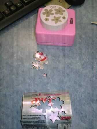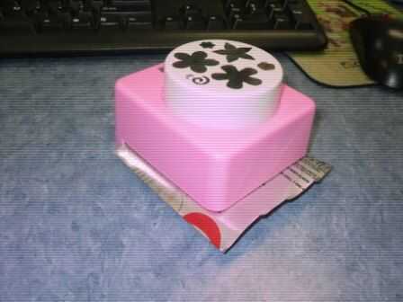 1. Coloque el punzón de flores sobre una superficie plana y resistente. Tengo el Punch de pétalos Petite de McGill, que golpea hacia fuera 3 flores 1", 2 pequeñas flores y la forma de 1 acento al mismo tiempo.