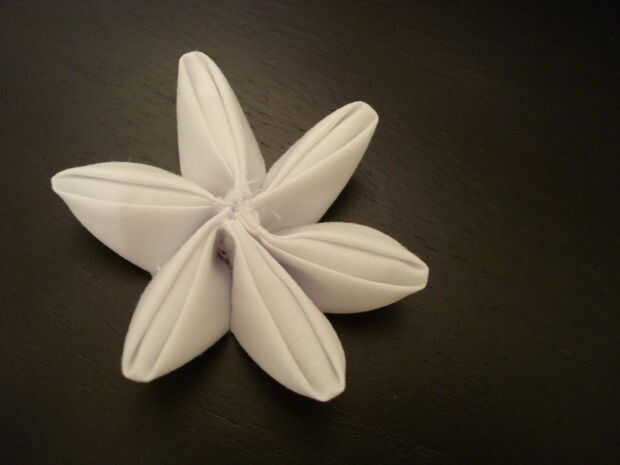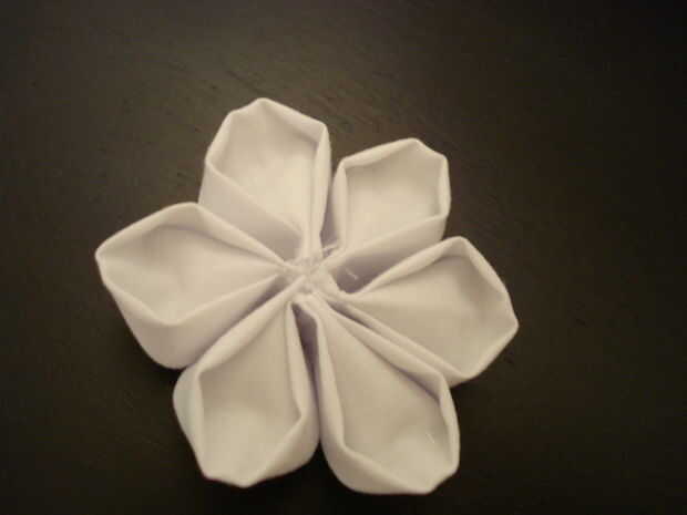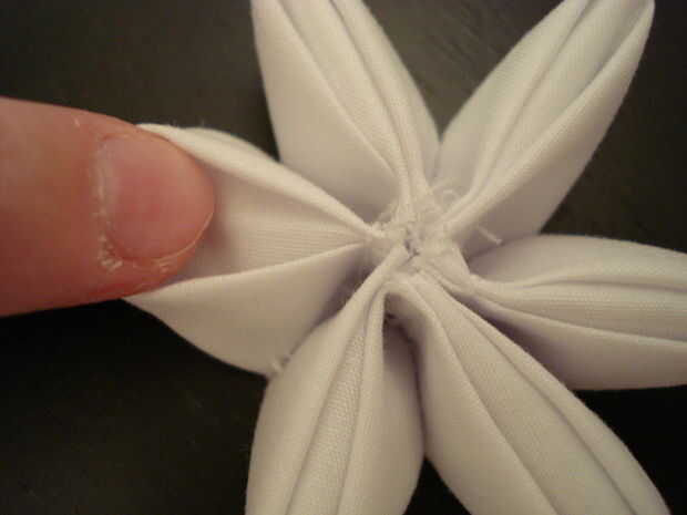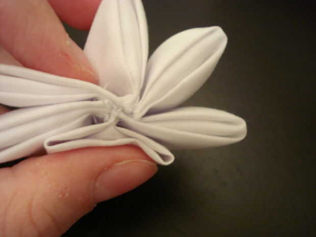 Utilice sus dedos para empujar el pliegue medio de cada pétalo como se muestra en la foto 2. Aplastar los pétalos al centro (Foto 3) que les ayude a tomar forma.
