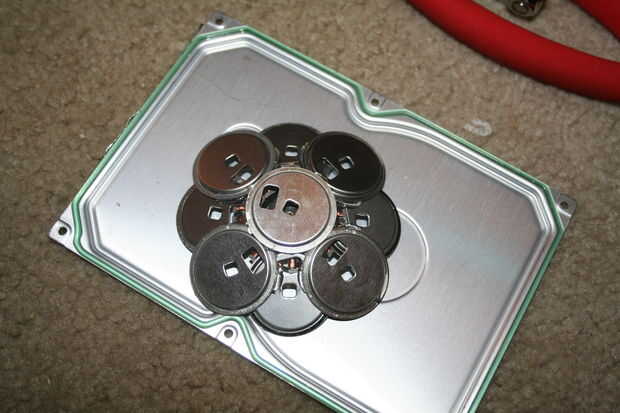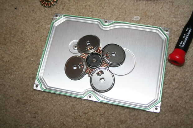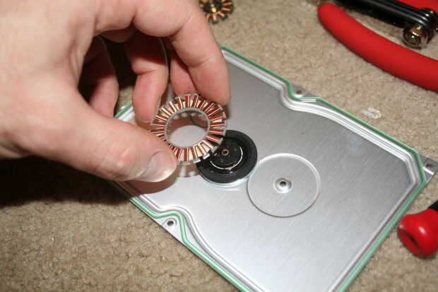 Tomar la tapa del motor de la disquetera. Coloque encima de lado sobre el mostrador. Coloque el bobina en la parte superior del motor. 8 de los centros de disco alrededor de la bobina del pegamento. Generalmente comienzan con 4, haciendo una X, luego pegue las otras 4 en los huecos después de que han establecido por un tiempo. Evita cosas estable demasiado. Cuando los 8 están bastante bien, pegue el ultimo centro de disquete en la parte superior.