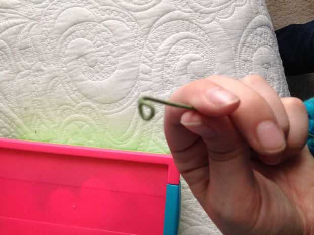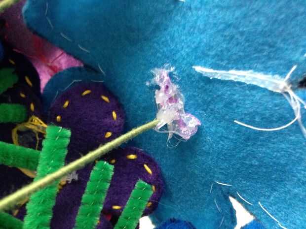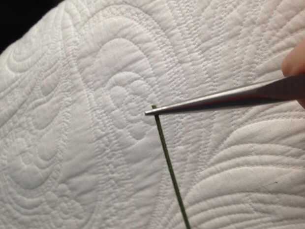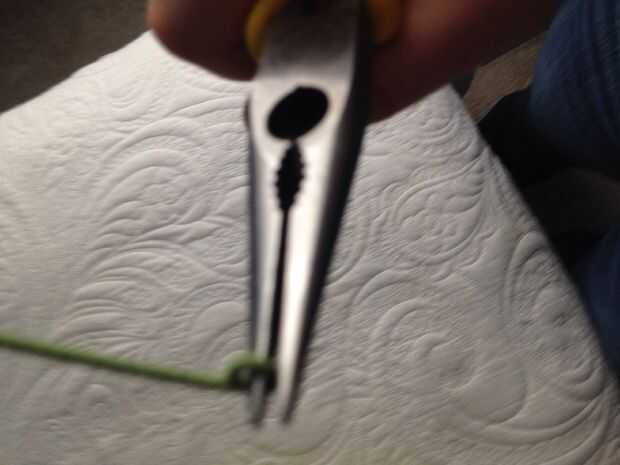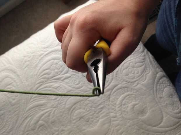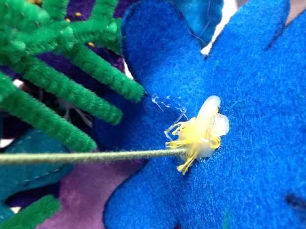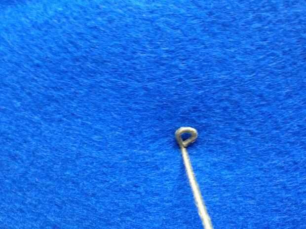 Usé pinzas para doblar un círculo en el alambre floral para presionar contra la base de la flor. Cosí los bucles completamente alrededor para asegurar. Parecía endeble. Caliente pegué todo a menos de una pulgada de su vida. Parecía estable. Lo llamaron una victoria.