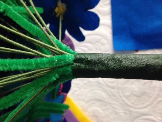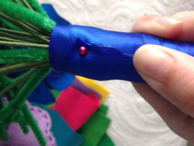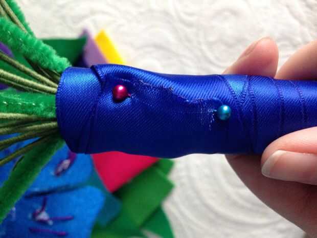 Inicialmente, envolvió los tallos como estaban, pero terminó como una jabalina de flores. Terminé cortándolos con cortador de alambre a una longitud más tradicional. Luego envolvió con cinta floral. Sé que usted puede ver algunos limpiapipas deja todo en allí pero no se pueden realmente ver en el ramo por lo que no les puse en las instrucciones. Vivir y aprender. Envuelva bien con cinta floral.