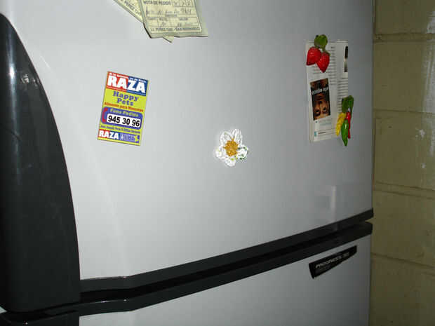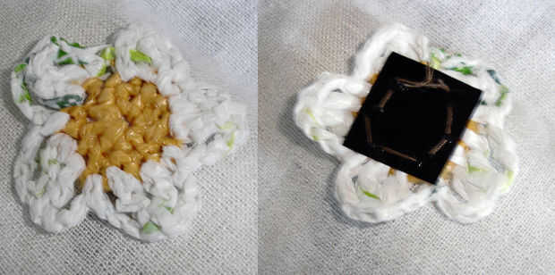 Sólo hay cortar un cuadrado del tamaño del centro de la flor del imán viejo. Luego se cose a la flor, cubirendo el lado impreso. Y listo, ya se puede poner en el refrigerador.