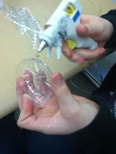 Después de cortar todo tome la parte inferior de la botella y las rayas de la botella del pegamento y pegamento a la parte inferior de la botella