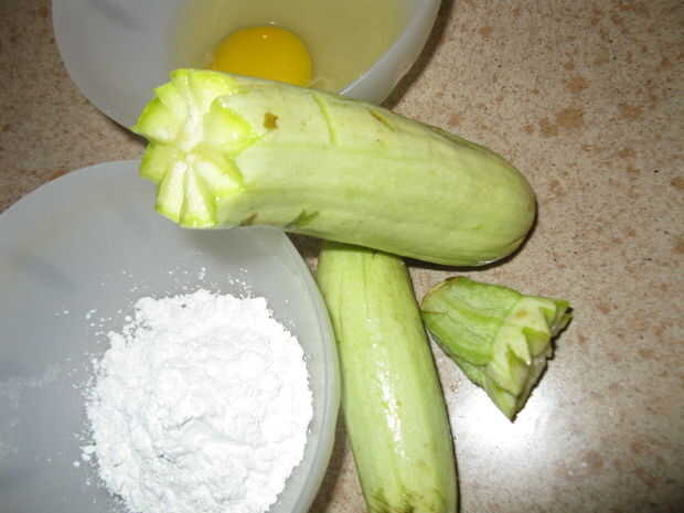 Primero, sumerja la flor de calabacín en huevo (completamente cubierta).