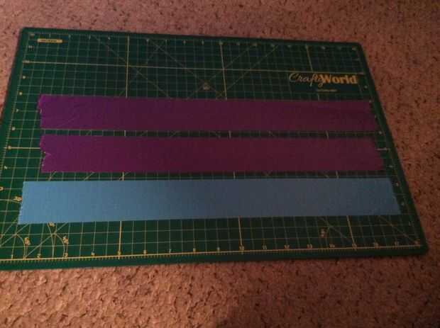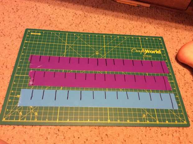 una vez que la cinta se establece en el uso de mat de corte premante marcador para marcar la cinta acerca de y pulgadas y sobre un 1 1/2 aparte.