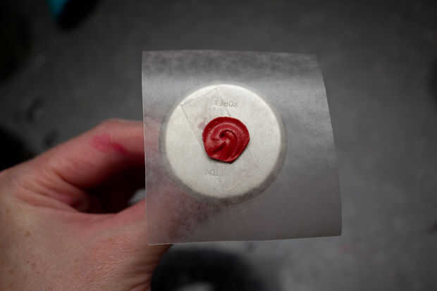 Cuando estés listo para empezar tus flores de tuberías, añadir un cuadrado de papel de cera a su clavo de flor, se pegue en el lugar con un toque de hielo o un trozo de cinta de doble cara. Empezar por un pequeño círculo de tuberías en el centro. No te preocupes si no se ve bonita, vas a ser apilado pétalos de flores en la parte superior.