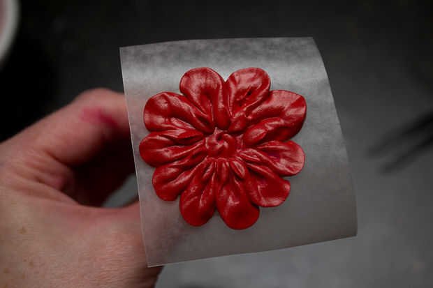 a continuación, comenzando justo en el borde del círculo de hilo, aplique presión a la Manga pastelera y tire hacia afuera, hacer un giro de 180 grados hacia el centro cuando llegue al borde de la uña de la flor. Liberar la presión al llegar al punto central donde comenzaste tu pétalo. Continúa alrededor del círculo, repitiendo este proceso hasta que haya un círculo completo de pétalos.