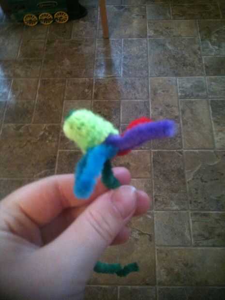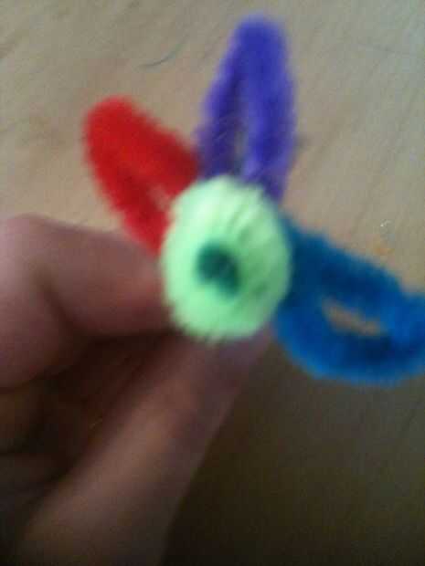 esta es una manualidad muy simple que uso a veces con mis castores y cachorros. Todo lo que necesitas es un tenedor, un limpiador de pipa y algunos hilados.1. Coloque el limpiador de pipa a través de los dientes mediados de la horquilla, con unos 5cm