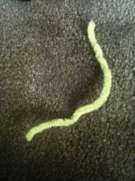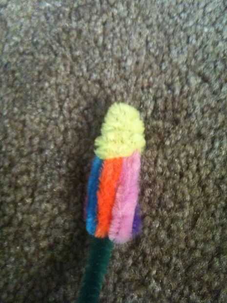 esta es una manualidad muy simple que uso a veces con mis castores y cachorros. Todo lo que necesitas es un tenedor, un limpiador de pipa y algunos hilados.1. Coloque el limpiador de pipa a través de los dientes mediados de la horquilla, con unos 5cm