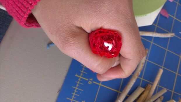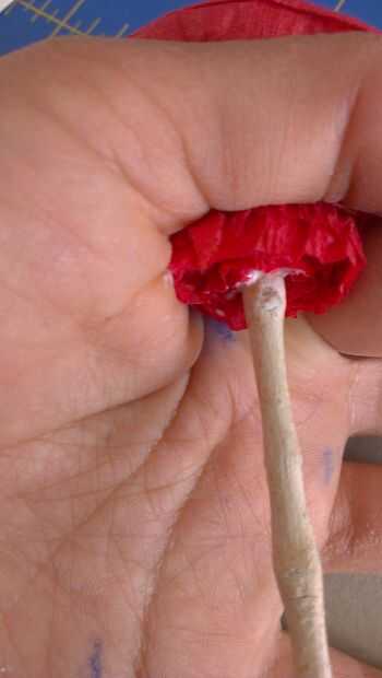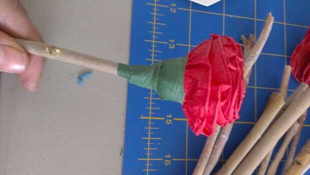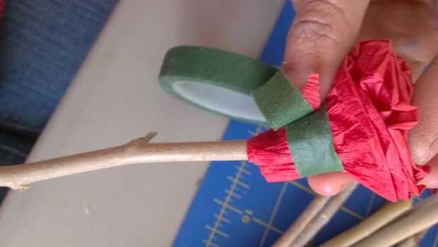 Coloque la flor entre la tumba y el dedo índice, poner pegamento en el centro, coloque el vástago, pulse y utilice la cinta verde para terminar.