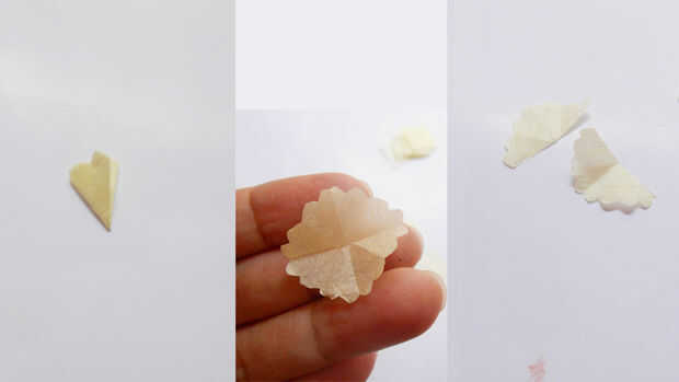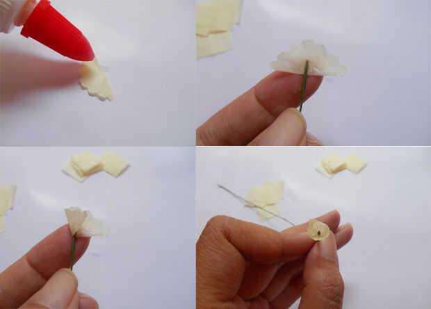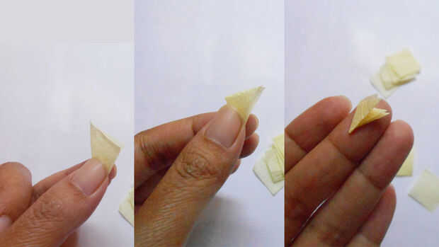 1. cortar papel de seda amarillo y blanco pálido 2 cuadrado de cmx2 cm
