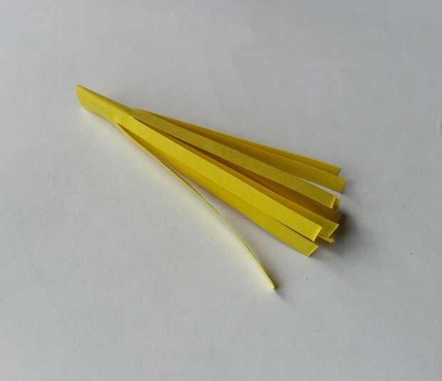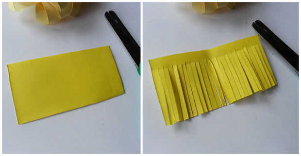 Tomar pequeños trozos de papel amarillo y cortar flecos finos en ellos. Rollo de papel con flecos y pegarla en el centro de la flor.