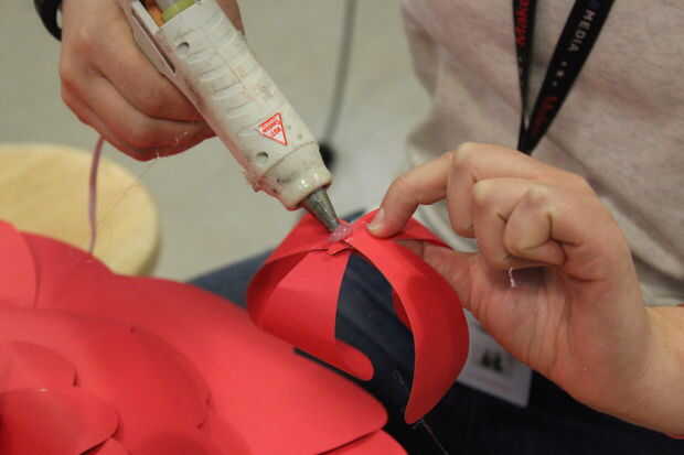 Poner un poco de pegamento en la punta de un pétalo dentro de los rizos.