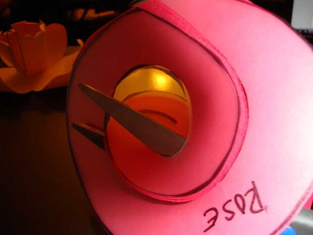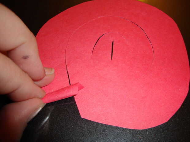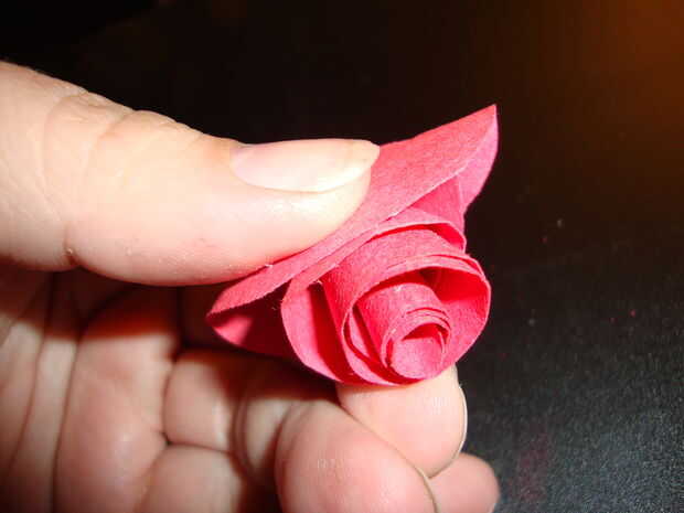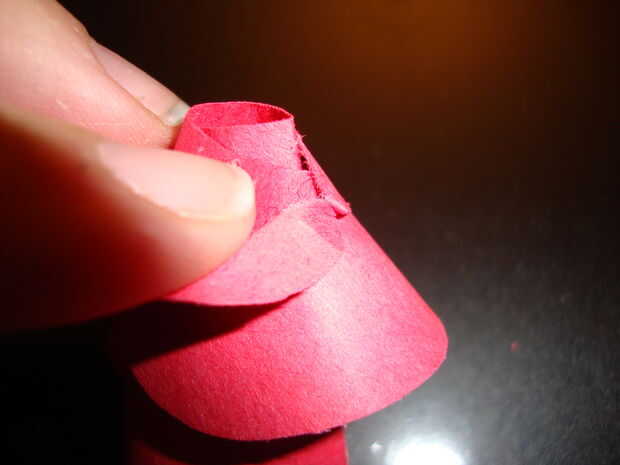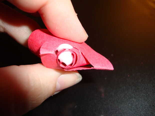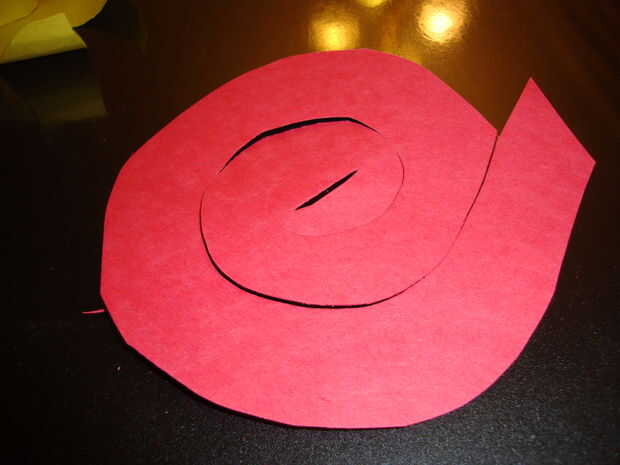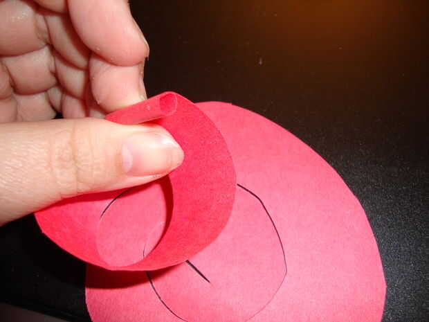 Rollo de la espiral con los dedos para hacer el papel capas más capaz. Una vez que tenga una forma de color de rosa que te gusta, empuje el borde exterior de la espiral (este es el intro del patrón rizado) hacia abajo a través de la ranura. el papel enrollado debajo de la última espiral de la muesca y la ranura central de la cerradura en la muesca.