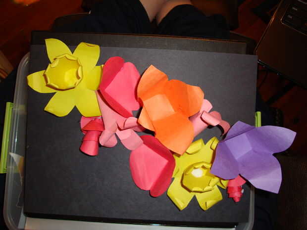 Papel de uso verde enrolla tallos, pegar las flores en los tallos y crear un arreglo de flores de papercraft.
