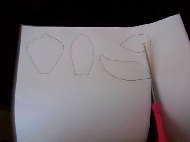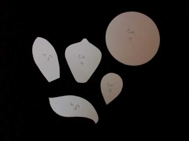 Imprimir la plantilla (véase la primera foto abajo) y traza las formas en papel grueso o cartulina y luego cortar las piezas (si la impresora admite tipos de papel más pesado, puede imprimir directamente en la cartulina de sí mismo y luego cortar las piezas!) En el lado equivocado de una hoja de tela fusible de interconexión (el lado del pegamento/fusible debe ser mirando hacia abajo), traza las formas como sigue: cuatro pétalos grandes, cuatro pétalos de tulipán dentro, cuatro pétalos de tulipán del lado derecho, cuatro pétalos de tulipán de la izquierda y doce hojas (el número de cada forma a ser cortada se observa en cada pieza de la plantilla, así que esto es fácil!) Establecer el círculo de los recortes de la plantilla. a ser utilizado más tarde!