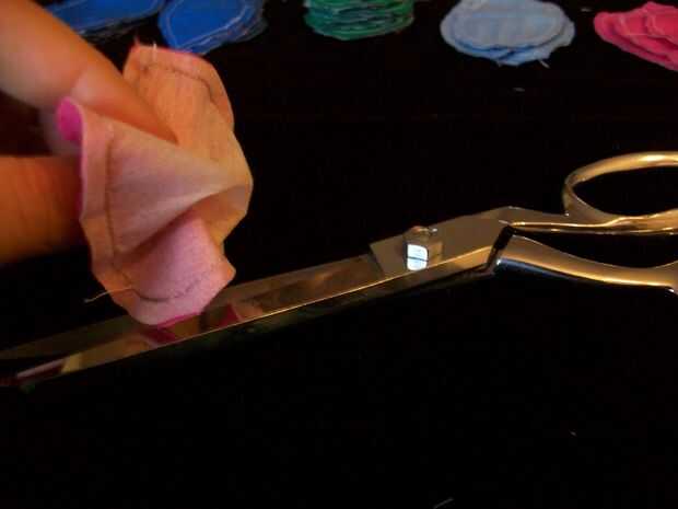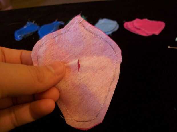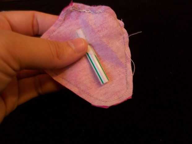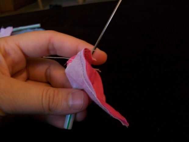Trabajar con cada pieza individualmente, suavemente apriete para que el fusible web levanta un poco; entonces, usando la punta de un fuerte par de tijeras, clip una raja pequeña en la web fusible. Entonces, con un corte de paja y un imperdible o bambú fino palillo (con sus bordes desafilar), invertir cada pieza.