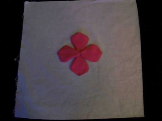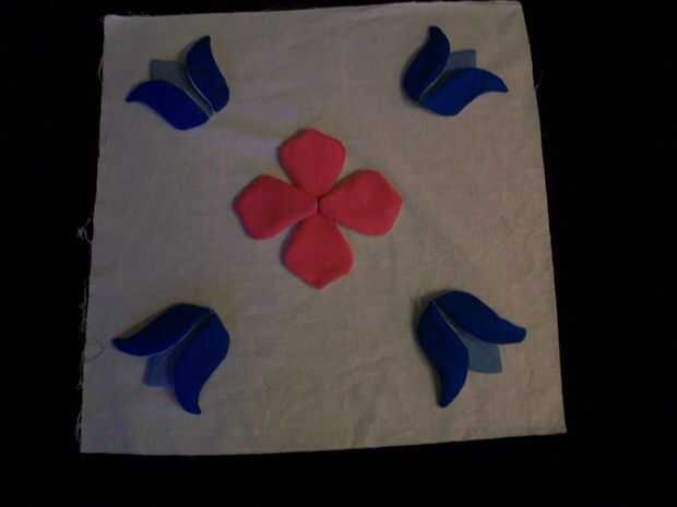 Corte 16" por 16" color sólido cuadrado de una tela de color claro y arreglar los cuatro pétalos amplia, simétricamente, en el centro. Cerca de cada esquina, arreglar el pétalo medio de cada tulipán, para que su punta enfrenta a la intersección de la esquina (véase el cuadro abajo) El resto de las hojas y los ranúnculos (que nos a coser en un poco)! se puede organizar en cualquier patrón!