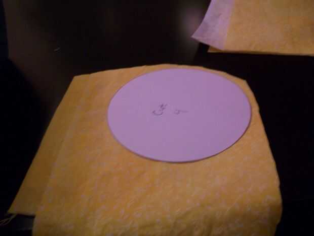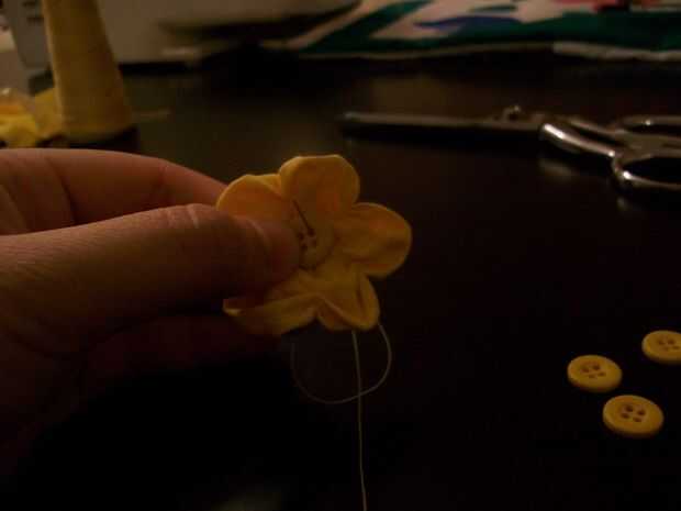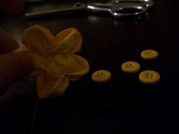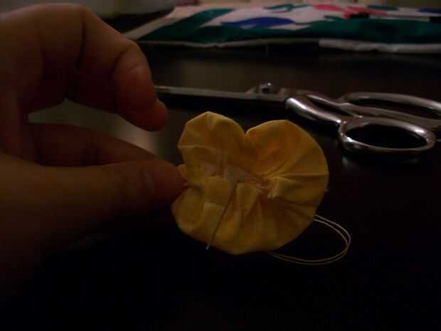 Con la plantilla de círculo-corte, corte cuatro círculos de tela. Utilizando una mano aguja e hilo (no doblado), mano coser una costura única a lo largo del extremo exterior de cada círculo. Trabajando con cada uno individualmente, tire de la costura hasta que reúne está libremente y uniformemente distribuidos en el círculo. El centro de prensa y suavizar hasta un pequeño agujero en el centro. Se trata de un yoyo, y va a ser utilizado como un botón de oro! Sacar la aguja a través del centro del yoyo y tire hacia arriba de una sola puntada, cerco sobre el yoyo; Tire la puntada apretada, hasta que un pliegue es evidente. Gire un poco el yoyo y repetir esto hasta que hay cinco pliegues, tirado firmemente; el yoyo se dividirá en cinco partes, y que va a ser evidente que estas porciones son pétalos! Devolver la aguja roscada al centro del yoyo (ahora un ranúnculo), dale la vuelta y soltar un botón en su centro; Apriete el botón al botón de oro.