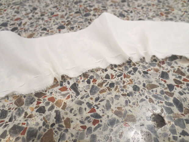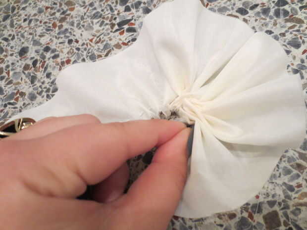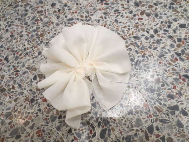 Para crear una flor incluso, es importante tirar de la tela a lo largo de la rosca para acoplar otra vez. No tiene que ser totalmente plana, lo suficiente como para que tengamos más control sobre cómo reúne en el centro.