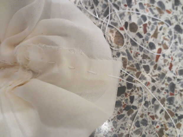 Con la misma puntada como antes, unir ambos extremos de la tela y coser hacia fuera. Otra vez usar esta puntada para coser en hacia el centro de la flor.