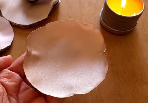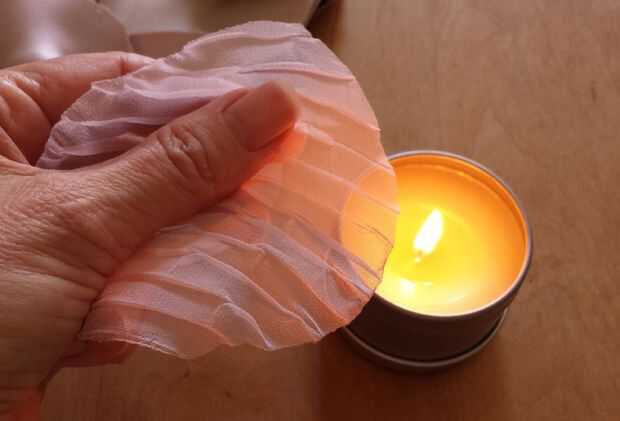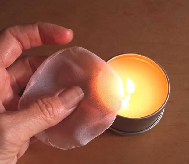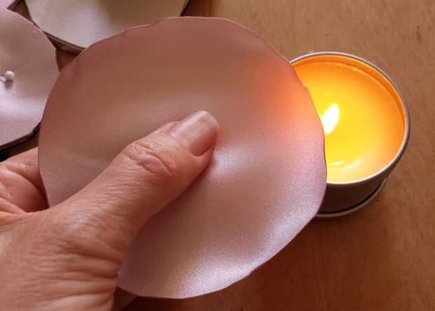 Cuidadosamente Mantenga los bordes de la tela círculos sobre la llama de la vela hasta que los bordes comienzan a derretir y se enrollan. Continúe girando el círculo hasta que termine toda fusión.