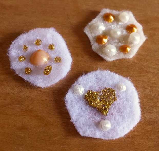 Otra opción para centros de flores, adornan pequeños círculos de fieltro con pegamento del brillo o pintura de perla.