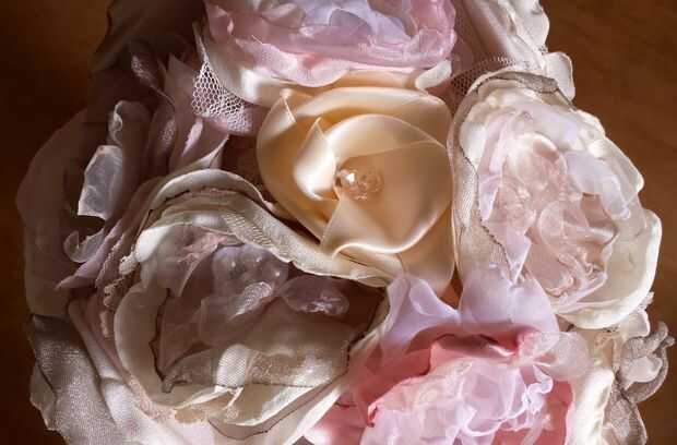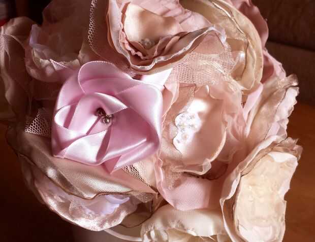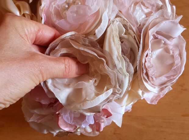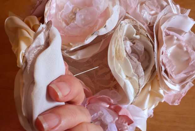 Cuando usted tiene un montón de flores, comienza Asamblea en la forma de bouquet. También añadí rosas de la cinta a mi disposición. Es mi tutorial para rosas de la cinta aquí.