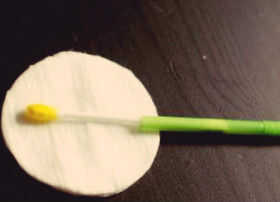 Una vez elaborados los hisopos de algodón, cada uno de ellos Introduzca el correspondiente número de pajas de beber. Asegúrese de que la parte sin pintar de la torunda de algodón no se inserta demasiado profundamente. No te olvides de colocar el disco de algodón bajo la pajita y el hisopo de algodón, como se muestra en la foto.