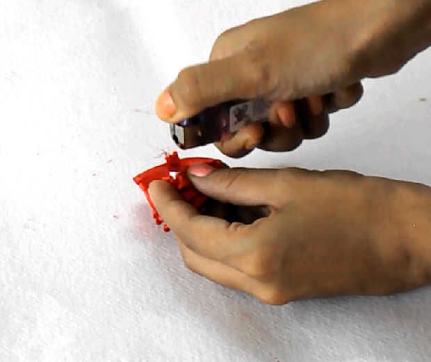 Quemar el borde de la flor de cinta de raso para deshacerse de los hilos sueltos.