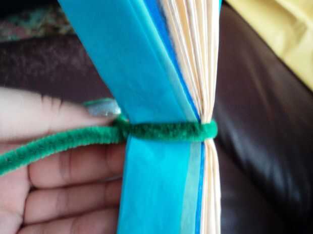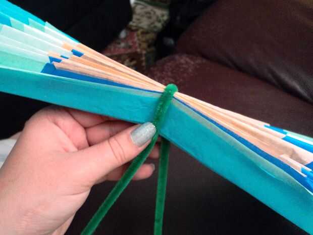 Coloque un limpiador de pipa alrededor del centro del papel de tejido doblado en acordeón.  Me pareció mejor dobla el limpiapipas por la mitad y luego girar los dos extremos de ella juntos para unir el papel doblado en acordeón.  Si no tienes limpiadores de pipa, cualquier alambre de amarre o alambre funciona e incluso podría ser capaces de utilizar cadena!  Dejé los dos extremos de largo para hacer más fácil fijar la flor a cosas para la decoración.
