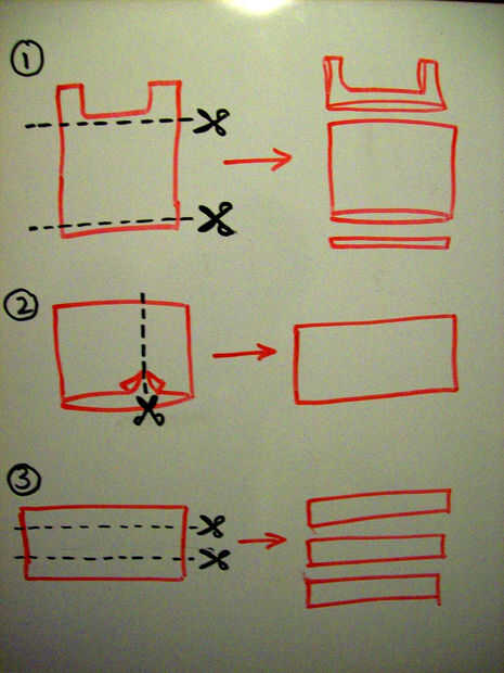 4) tomar una tira y doblar en un borde de 2,5 cm (1"). Seguir doblando una y otra vez para acabar con un rollo plano de plástico.