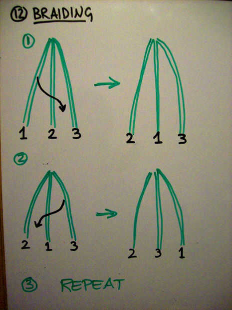 12) ahora emparejar los extremos de las originales tres longitudes y trenzar juntos firmemente.