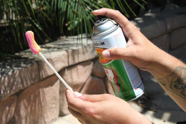Primero comience por colocar el maní envasado en palillos y ligeramente construir múltiples capas de diferentes colores fluorescentes. quisiera aplicar un color base y luego utilizando un color diferente. cebada se empuje hacia abajo de la boquilla para crear un efecto de salpicadura que da buen contraste.