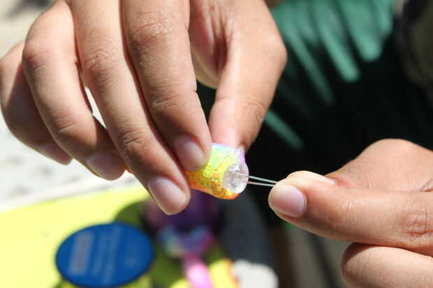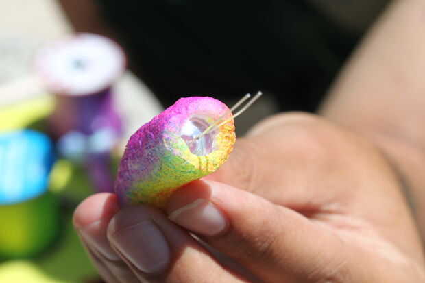 Sostener la parte superior y asegúrese de no aplastar su forma suavemente. Lentamente Inserte LED en maní, torcer hacia adelante y hacia atrás hasta que en el cacahuete la misma longitud que la segunda foto. Pegamento caliente el led después es seguro dentro del maní desde la parte inferior para asegurar que no sale.