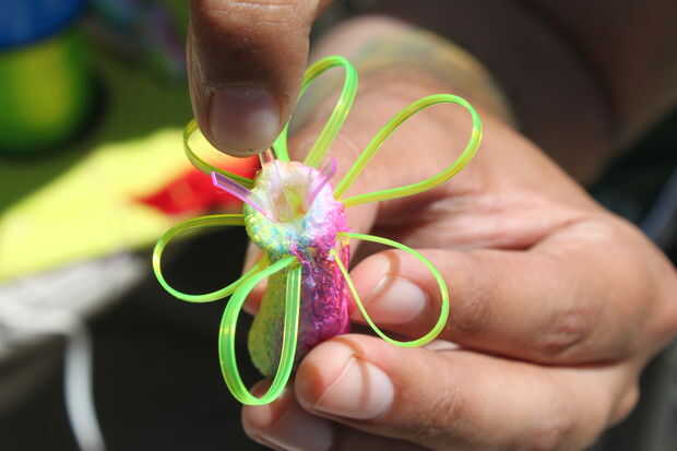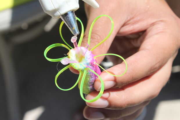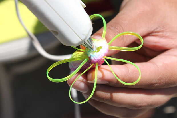 Caliente pegamento (cuidado de no quemarse, puede ser útil tener hielo cerca) el interior del maní hasta el LED para formar un "núcleo fuerte". Agregue sus "pistilos" y poner una gota de pegamento caliente en el extremo de ellos para un efecto agradable.