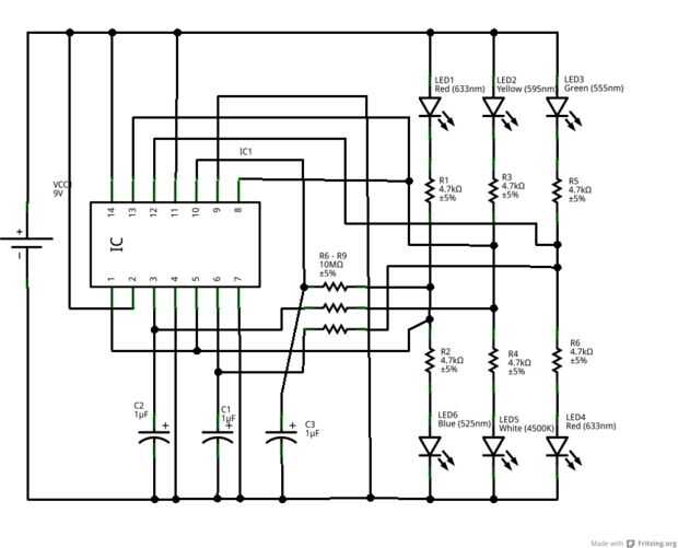 Soldar el circuito siguiendo el esquema a un perfboard. En lugar de soldar los LEDs, utilizar partes de la regleta de enchufe donde puede pegar las flores más tarde.