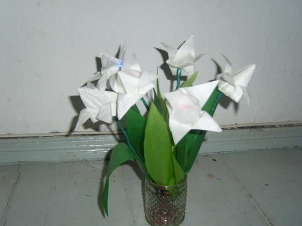 muy fáciles de hacermi primer instructivo:)Paso 1: Piezas necesarias:-papel de aluminio-placas de cobre pequeñas-tejido de papel-paja de plástico-1 LED de 5 mm, 3, 5V-lirio de origami - http://www.origami-instructions.com/origami-lily.html-los cables