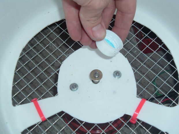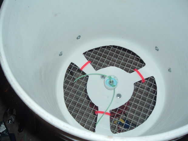 Instale una tapa de la botella de plástico de soda en el eje del motor perforando un agujero en el centro y apernado al eje. Haga dos orificios en el lado de alguna línea de condensador de ajuste de cadena. Utilizando el radio del cubo como guía, cortar y añadir alguna línea en la tapa. Nudos simples y la fuerza centrífuga mantienen la línea en la tapa. Nota: Este jefe puede mejorar de alguna manera, la tapa de plástico no es lo suficientemente fuerte como para algunas semillas más duras como la equinácea. Yo todavía estoy gestando en qué utilizar.