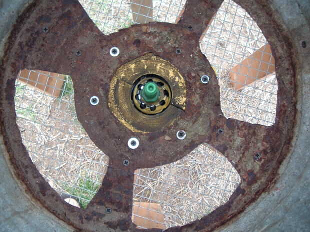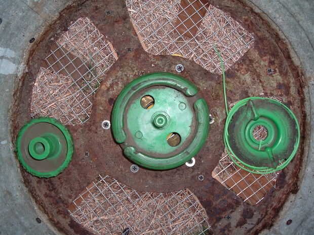 Ajusté la profundidad cabeza trimmer con bloques de madera para que la cadena está rotando. 25" por encima de la parte inferior de la lata; cualquier superior y deja basura grande que obstruye la pantalla.