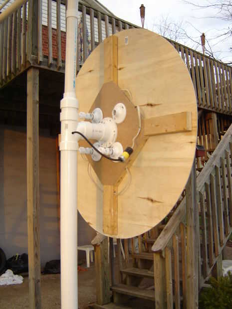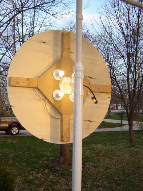 Para el círculo mongrammed, corté un pedazo de 4'x 8' x 1/4" madera contrachapada por la mitad. Encontré el centro de la Plaza de 4'x 4' y dibujó el círculo usando un clavo pequeño en un palillo de la yarda en la marca de 24". Corte de una pequeña muesca en el extremo de la vara yarda ayudó a mantener el lápiz en su lugar mientras el círculo. Recortar con una sierra de calar. Construí un soporte cruzado de 2 x 4 y luego pegado y había clavado en la parte trasera del círculo. Para proporcionar un espacio para conectar las luces, agregué un cuadrado grande de cartón sobre el soporte transversal, que también proporciona más rigidez a la pieza. Adjunta cuatro luminarias de plástico y por cable. Elegí el plástico sobre la cerámica sólo por peso. Por último, utilicé un reborde del inodoro 4" atornillado a los soportes transversales. Quería el círculo bien fijada, pero también ser desprendible para que el pegamento no era una opción. Yo optó por perforar a través de la brida y el tubo y utiliza un perno grande para unir a los dos.